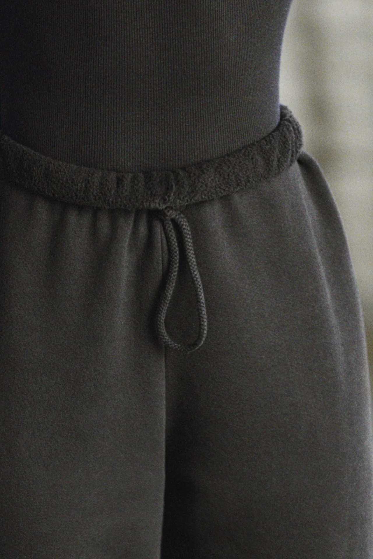 Jogger in an oversized silhouette with an elastic waistband and gathered ankle cuffs. Features an adjustable hidden drawstring at the waist.